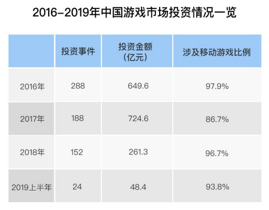 根據(jù)硬核聯(lián)盟發(fā)布的《2019硬核聯(lián)盟白皮書》,2019年上半年,游戲投資事件僅有24起,推測整年約50起左右,與2016年近300起投資事件相比有大幅縮水。同時,投資金額在經(jīng)歷2017年的724.6億元小巔峰后,2018年迎來暴跌,2019年全年預(yù)計(jì)僅100億左右。